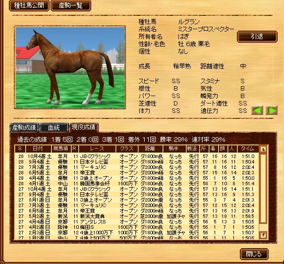 牝馬を期待したんですが願いかなわず 見事牡 俺の祈りよりぱおっちの祈りの方が強かったみたいです(´.`) パニックローズの仔で気づいたんですがうちのパニックローズの後継の オオヤマツミがスピードとパワーの因子持ってたんですね 知りませんでしたよw ただものすごくピーク時間が短いんです 昨日の近況で3歳馬がすでにピーク落ちしてました まったく調教間に合いません>< 昨日、ウイさんから2歳馬をいただきました 良いパラみたいなので重賞勝ちたいな(´.`) でも俺が育てると高パラでも駄馬に早変わり・・・ よくあることです>< PR 2歳馬でうちの厩舎初の芦毛が生まれました ドリパーが引退しました