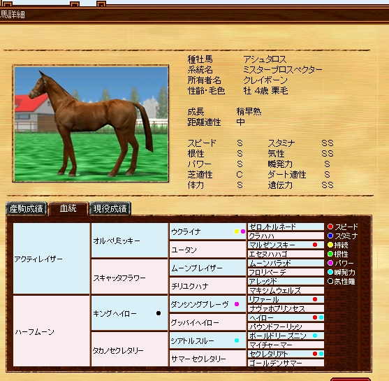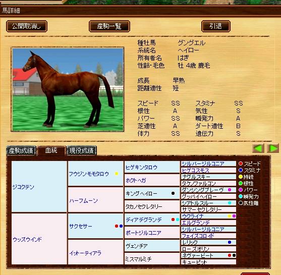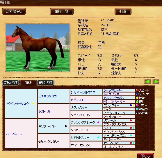 うちの種牡馬を載せたいとおもいます まずは・・・ 偉大な母であるハーフムーンの仔です キンタロウの血が騒いだのでしょうか見事2ゲッターでした 次は僕に初OP勝利をくれた馬で この馬の仔たちに重賞勝ちでもプレゼントしてもらいましょうw そして期待の種牡馬 G1二着馬で実績は十分なぜかこの馬の仔が 超早熟になりやすいのですが・・・(´・ω・`) と まぁ~こんな感じです テストの感想としては結構めんどくせ 1回1回画像読み込ませてダウンロードしてと・・・ 連続で載せるならいいけど1枚だけだと ちと面倒かな~って感想です 慣れれば問題無いよね・・・きっと(´・ω・) ブログ書いてる途中でマイルCS南部杯があり みごとみっちゃんが勝利! 初G1(*゜▽゜)/゜・:*【祝】*:・゜\(゜▽゜*) しかもレコードのおまけ付きとは・・・ やるの~ ええの~ で ばら撒きまだー(・∀・)っ/凵⌒☆チンチン